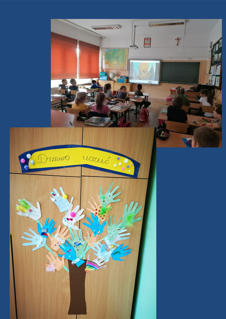 Pani Marta Gałan razem z klasą II „b” zastanawiała się nad postępowaniem Grzesia z wiersza Juliana Tuwima. Uczniowie wspólnie wykonali Drzewko uczciwości. Dzieci zamiast liści zawiesiły słowa kojarzące się z uczciwością w odbiciach swoich rąk. Podając plotkę – dzieci świetnie bawiły się w Głuchy telefon.