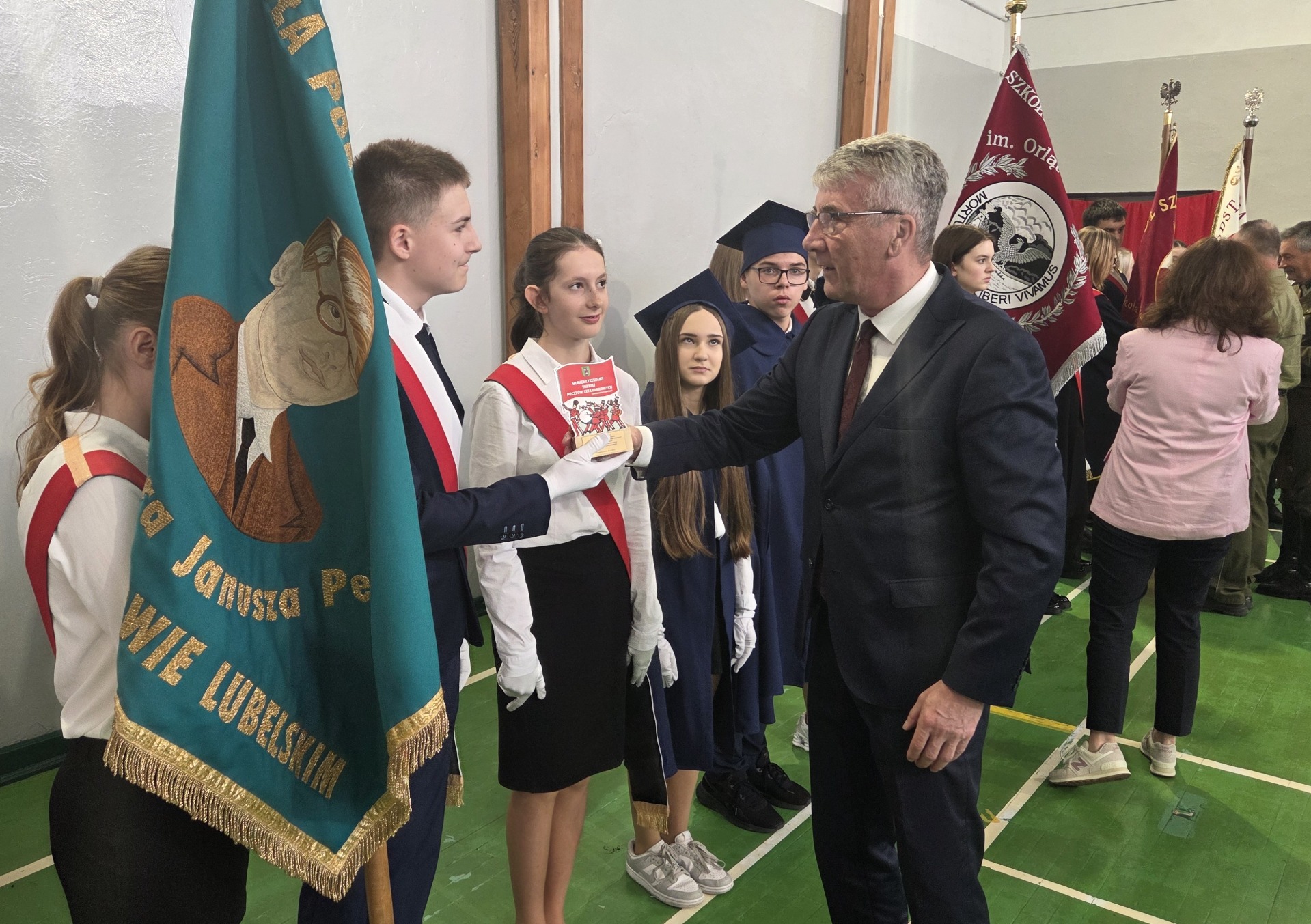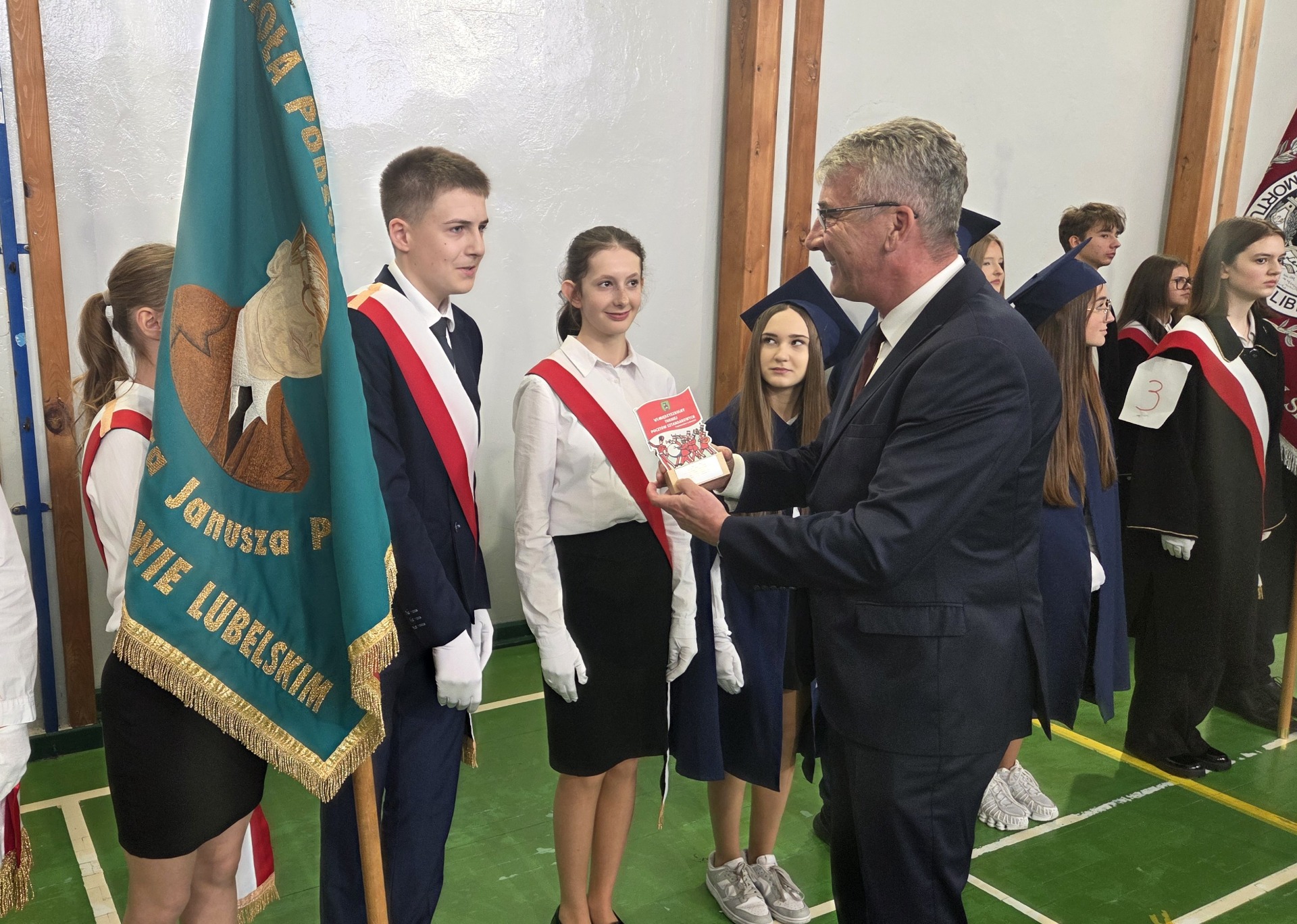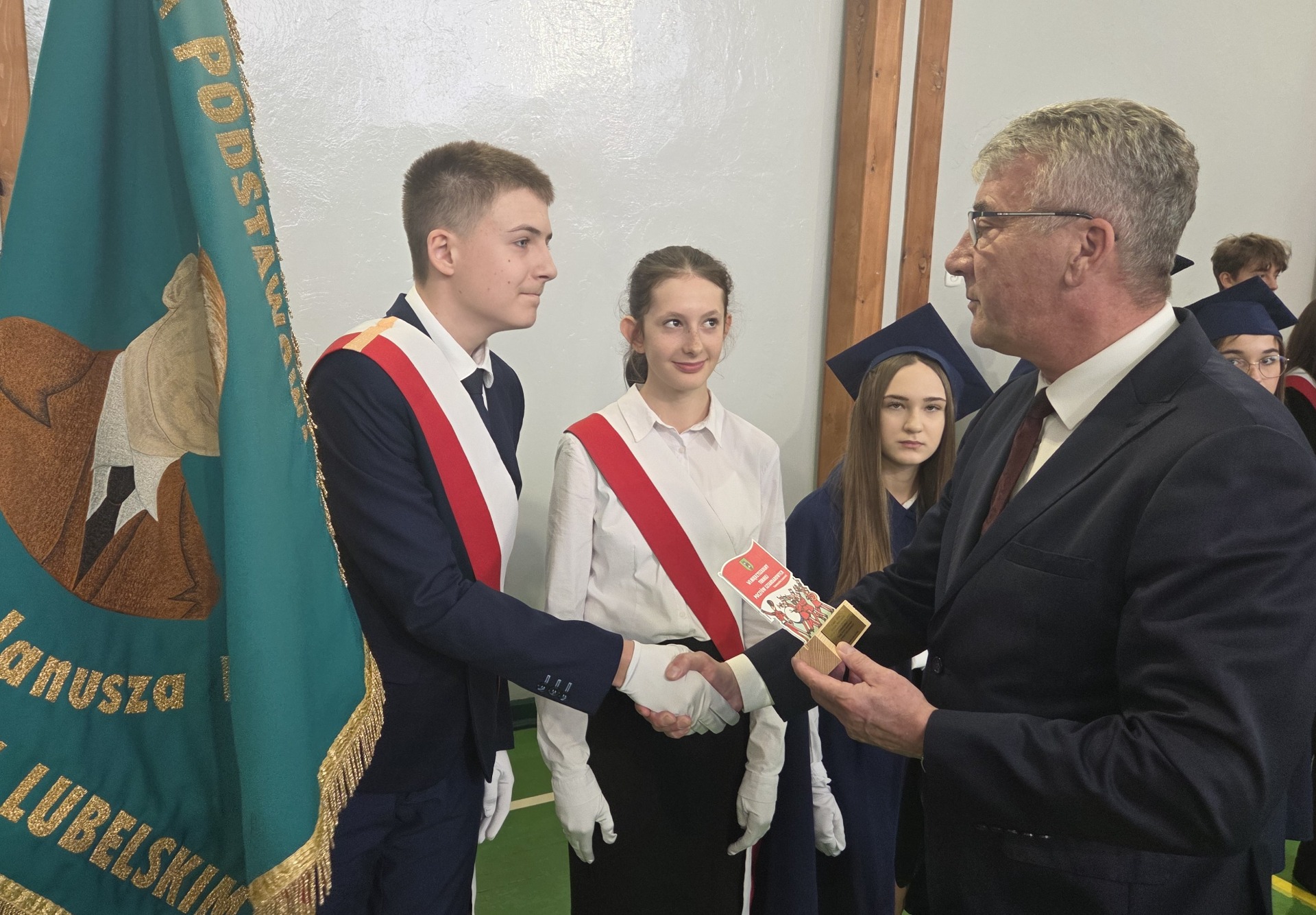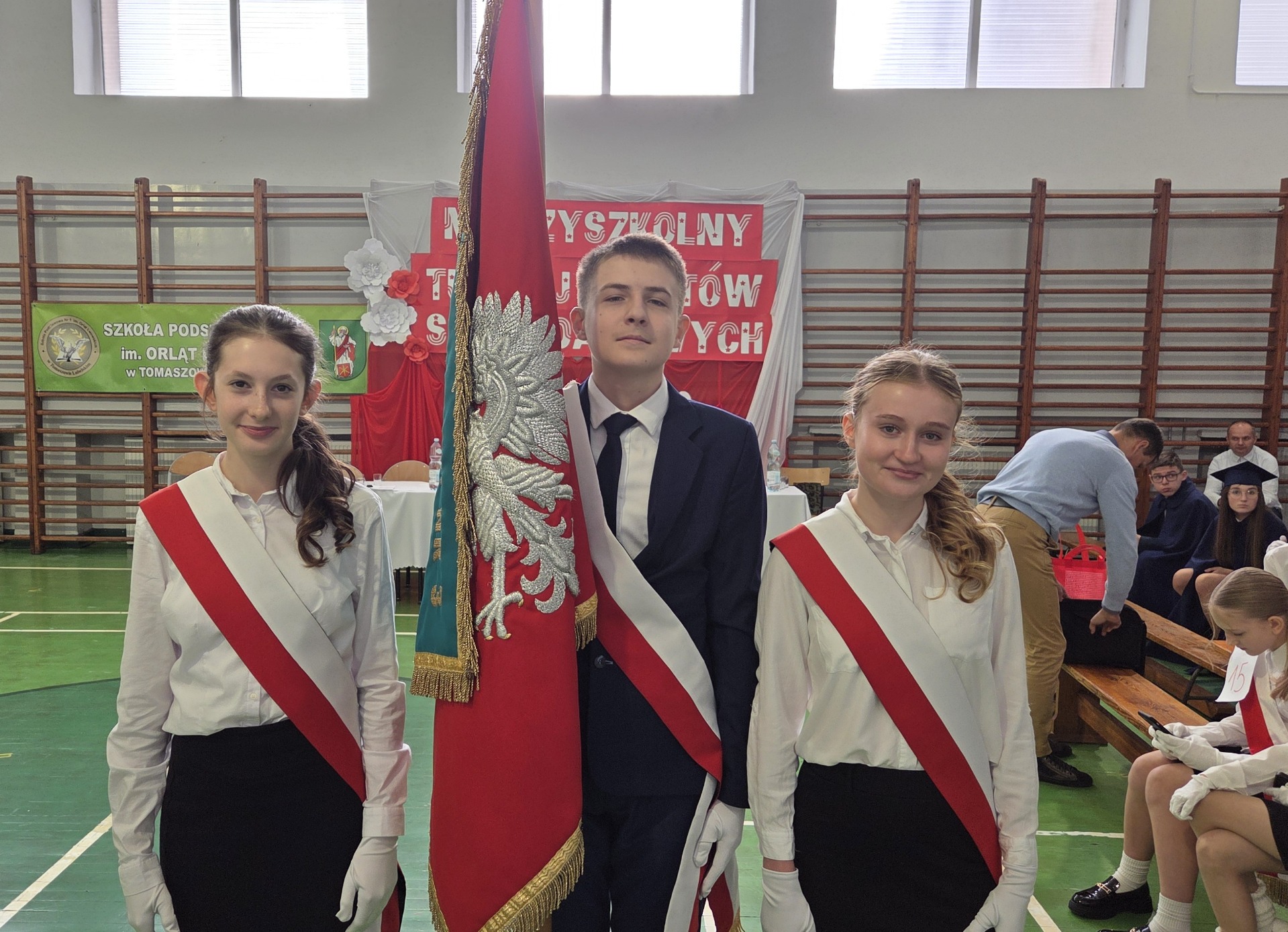 W dniu 29 października 2025 r. w Szkole Podstawowej nr 1 w Tomaszowie Lubelskim odbył się VI Międzyszkolny Turniej Pocztów Sztandarowych. Naszą szkołę reprezentowali uczniowie: Katarzyna Gaca, Szymon Kornaga i Magdalena Kita. W konkursie „Wiedzy o symbolach narodowych i ceremoniale szkolnym” wygrał nasz uczeń Szymon Kornaga. Gratulacje Szymon! W konkursie „musztry” wracamy z IV miejscem! Dziękujemy Wam serdecznie! Brawo!
